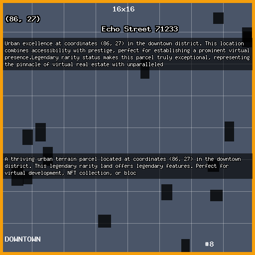 A thriving urban terrain parcel located at coordinates (86, 27) in the downtown district. This legendary rarity land offers legendary features. Perfect for virtual development, NFT collection, or bloc